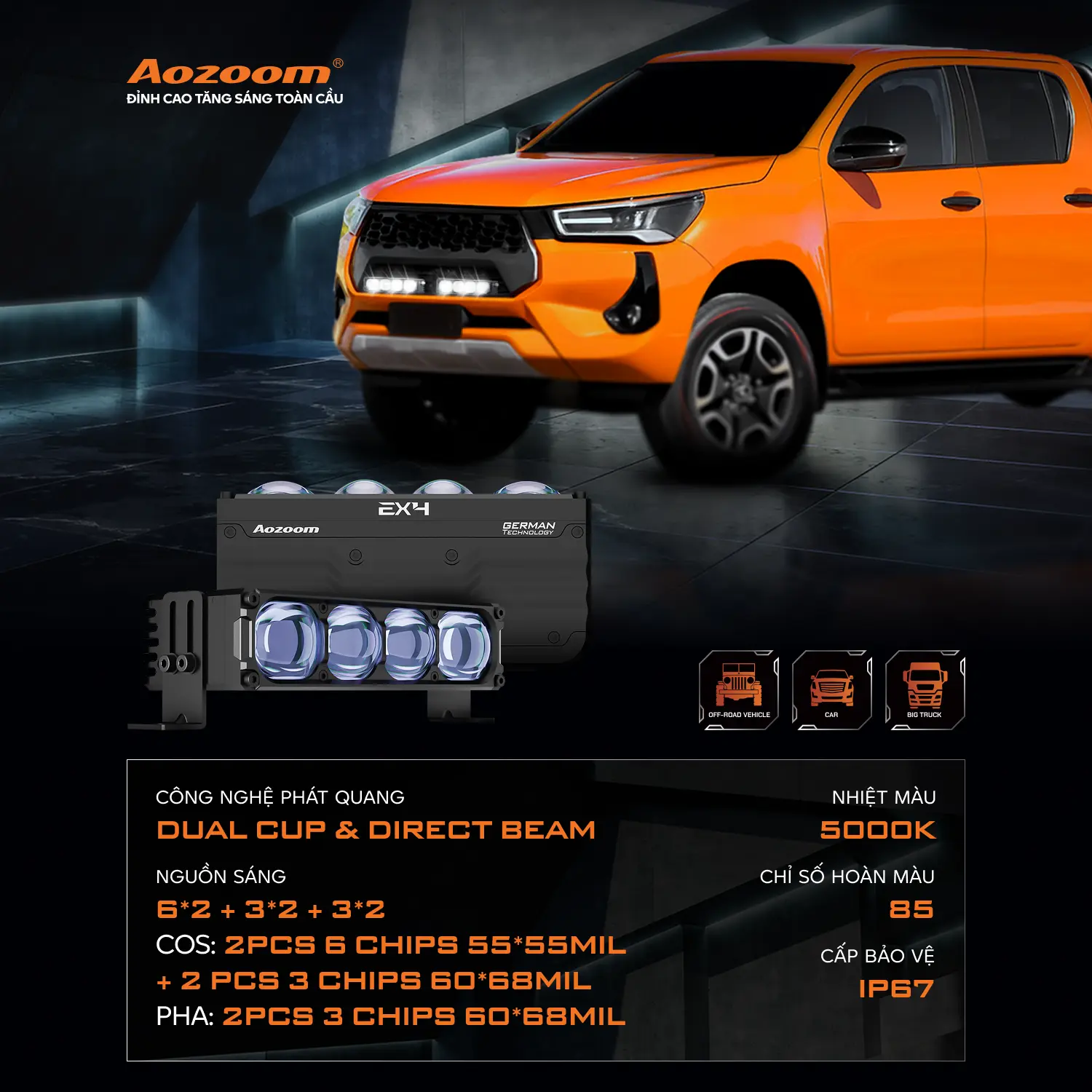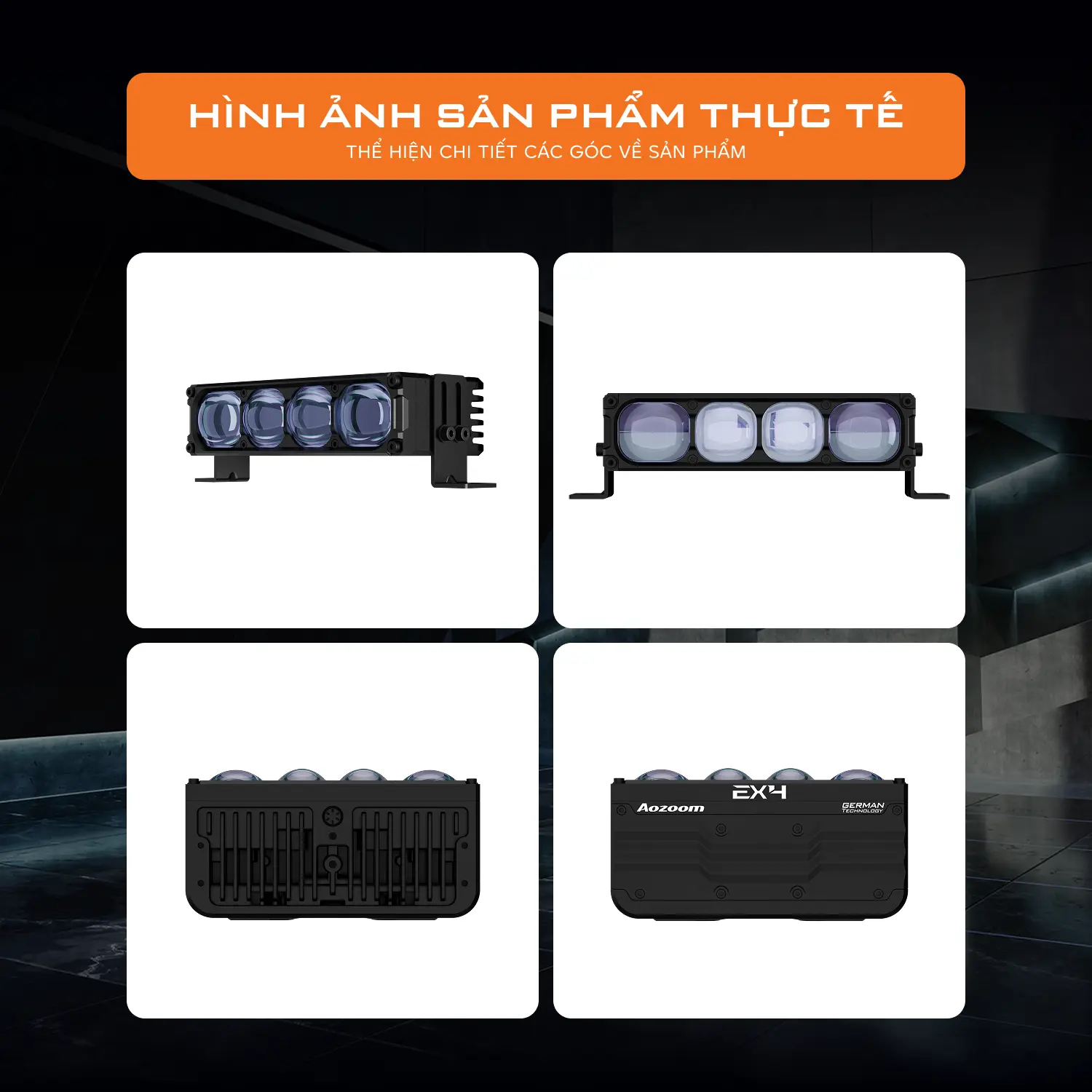 Hội tụ những công nghệ chiếu sáng đỉnh cao, EX4 kiến tạo một trường sáng siêu rộng, khai phá giới hạn mới của đèn gầm dạng rời. Với thiết kế Quad-Lens Matrix độc đáo và thân đèn siêu mỏng, EXTRA 4 tạo ra dải sáng cos rộng hơn 300%, bao phủ đến 6 làn đường, mịn và đều như cực quang. Chế độ pha Direct Beam công suất 108W mang lại luồng sáng gom tụ cực đại, mạnh mẽ không gây chói lóa.